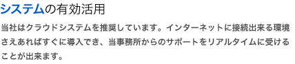 当事務所の事業所・従業員データをクラウドシステムにより共有し、顧問先事業所でいつでも従業員情報を確認することができ、業務受付をスムーズに行い、電子申請により手続きを確実にかつ、スピーディーに行っております。